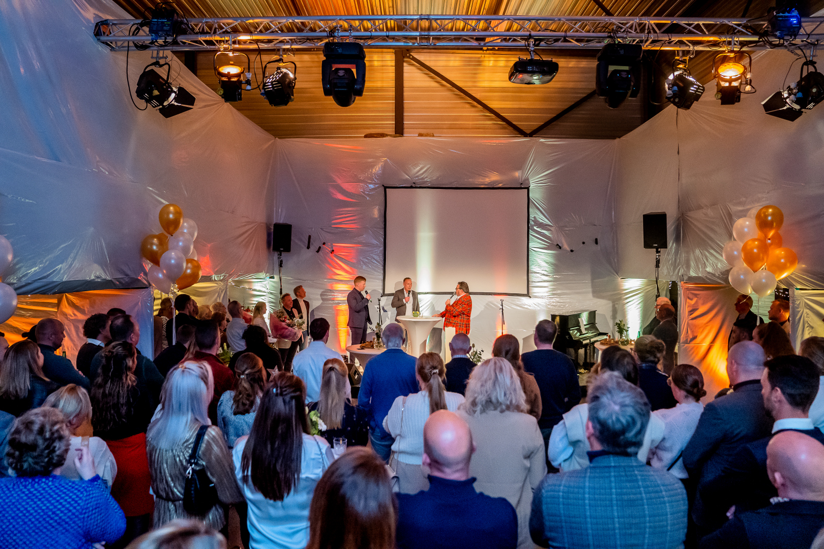 Voor de Knegt en Leeflang mochten wij voor hun bedrijfsfeest het tot feestlocatie ingerichtte magazijn uitlichten in het thema “Wit en Goud”.